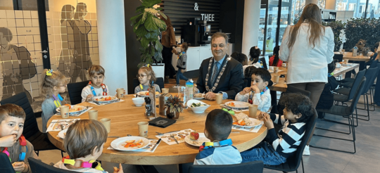 Taalschool Voila en burgemeester Bouwmeester ontbijten samen
