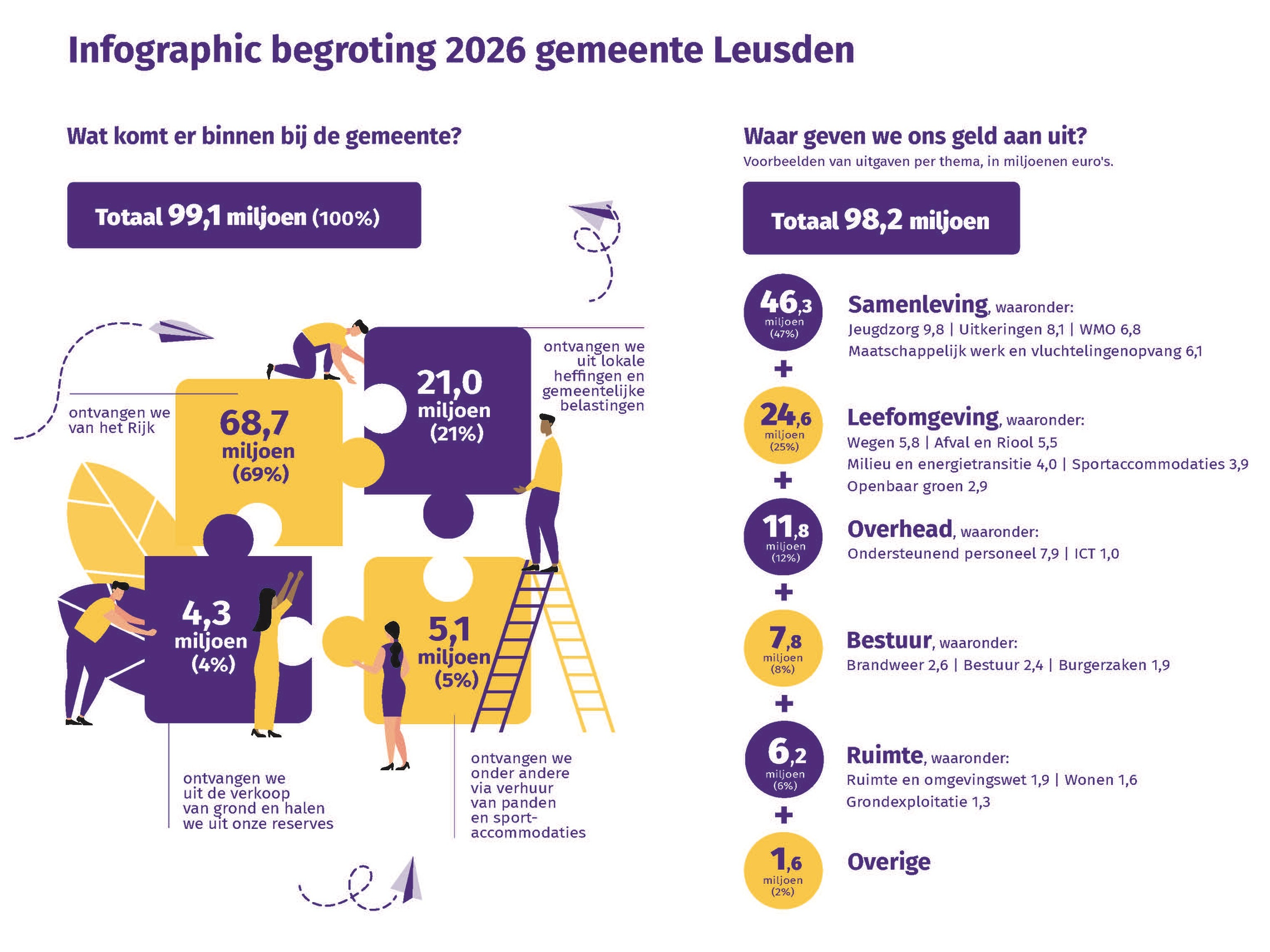De infographic begroting 2026 laat in één oogopslag zien hoe de gemeente er financieel voor staat en waar de gemeente haar geld aan uitgeeft. Dit bestand is niet toegankelijk voor mensen met een visuele beperking.