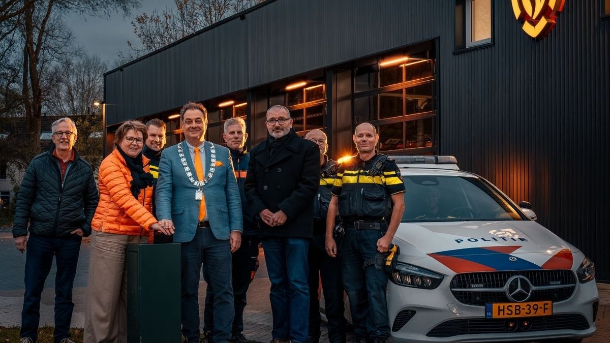 Op de foto staan v.l.n.r.: gemeenteraadslid Wout van den Brink, wethouder Marleen Treep, burgemeester Gerolf Bouwmeester, Jacques Happe (Samen Veilig Midden-Nederland) omringd door medewerkers van brandweer en politie.