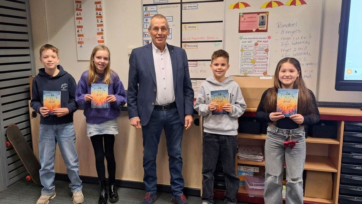 Wethouder Frank de Wit heeft de eerste boeken overhandigd bij basisschool ’t Palet.
