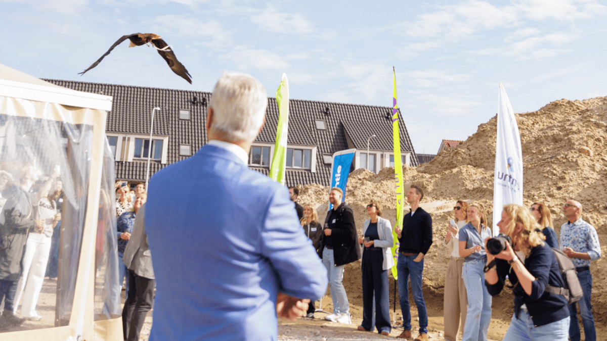 Met een spectaculaire vlucht bracht een grote roofvogel de sleutel van de bouwplaats naar wethouder Wim Vos van de gemeente Leusden, die op zijn beurt de hekken van het slot haalde. Daarmee is de bouw van het nieuwbouwproject, uitgevoerd door Koopmans Bouw, op bijzondere wijze officieel van start gegaan.