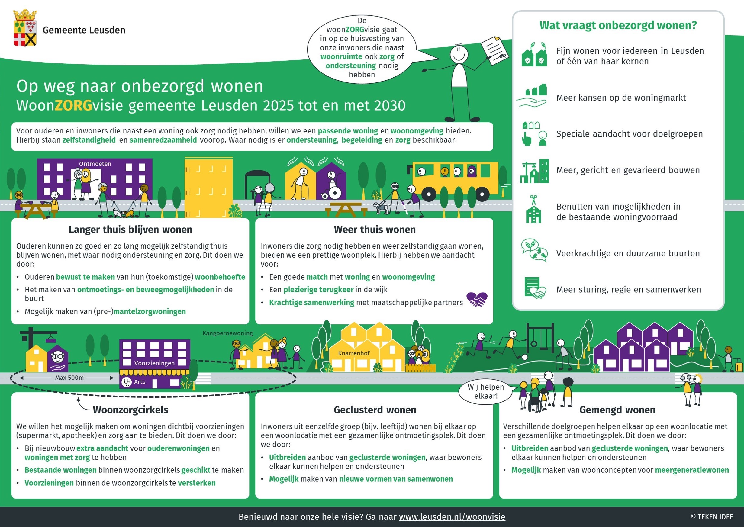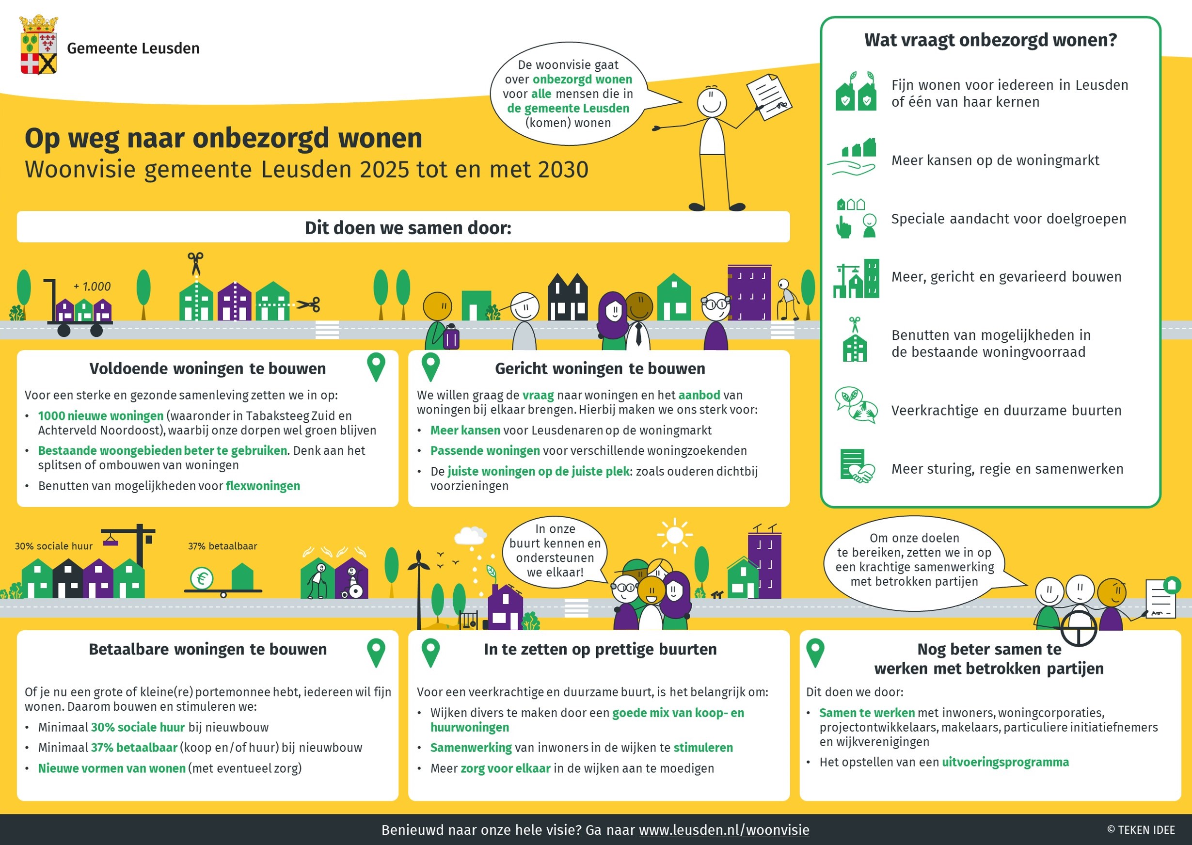 Wilt u meer weten over hoe wij tegen de Leusdense woonopgaven aankijken en wat onze ambities hierin zijn? Dat kunt u lezen in onze visies met bijbehorende infographics. Deze documenten zijn niet digitaal toegankelijk. De infographics zijn gemaakt door Linda Ursem, Teken Idee.